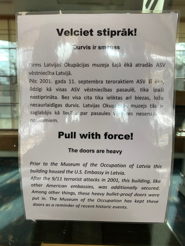 Back in the city and I got dropped off at the Museum of Occupation – it was a smaller exhibition than normal as the normal building is being refurbished so it is being housed in the old US embassy.  As I entered the building, my attention was drawn to a sign on the very heavy bullet Proof door. After the 9/11 terrorist attacks, most American Embassies were additional secured, adding heavy bullet proof doors like this one!  It certainly makes you stop and think – well it did me anyway.
