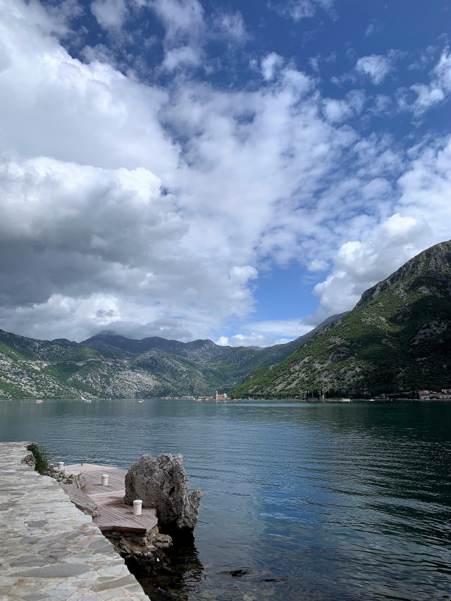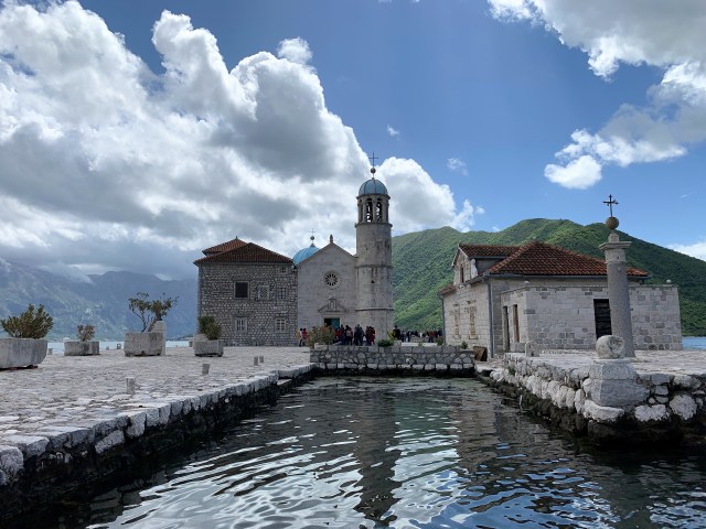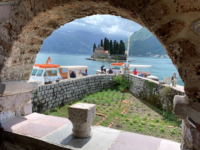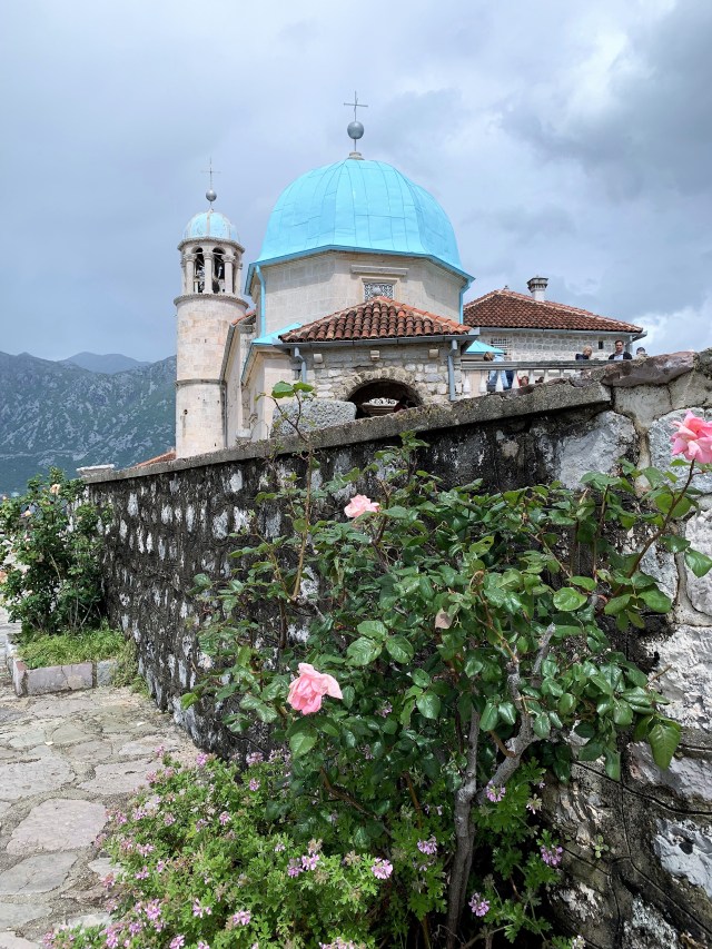 It was from here we had our first view of Our Lady of the Rocks, one of the small islands off the coast. The island is manmade, and according to legend it was created over the centuries (dating back to the 1400’s) by local sea men laying a rock in the bay after each successful voyage after finding the icon of Madonna and Child on the rock in the sea. As well as rocks, the island has been built up by the sinking of old ships loaded with rocks.