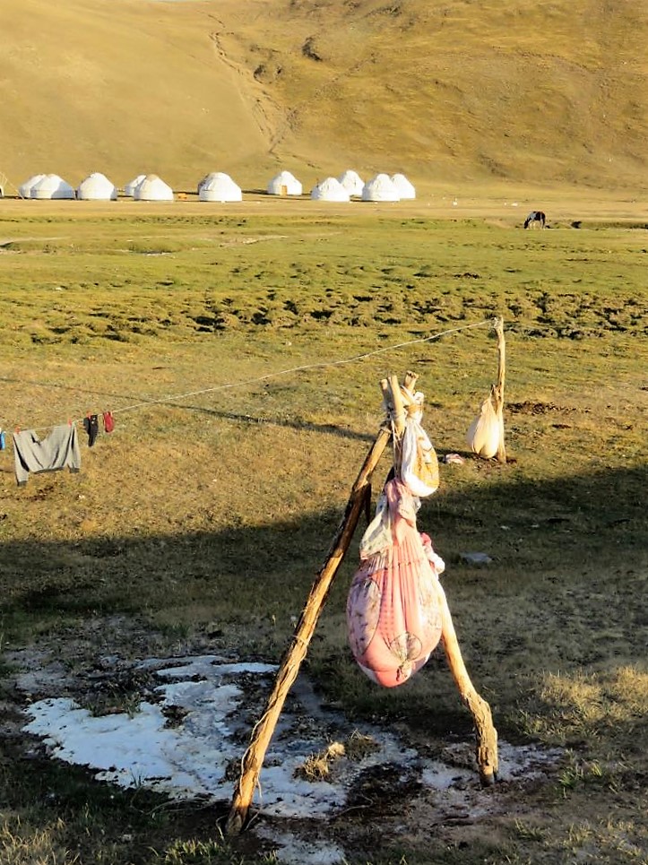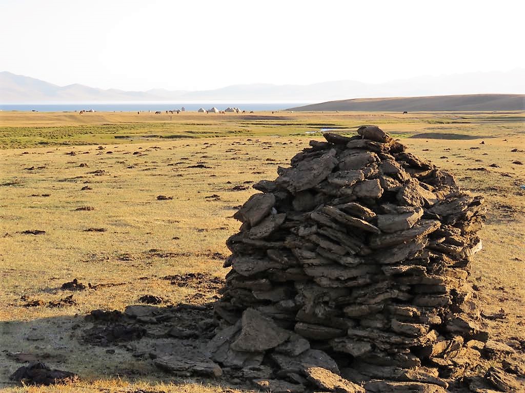 We quickly dropped off our bags in our allocated yurts before walking a short distance to visit a local nomad yurt. As there are no trees at this altitude so they pack down cow manure in to bricks to use as fuel in their fires. Apparently, it is slow burning and kepts the heat well. We then tried fermented horse milk – like fermented fizzy very sour milk but it was not as bad as it sounds and definitely not as bad as the kurut (oh but they make that too and that is what is in the hanging bag in the photo below).