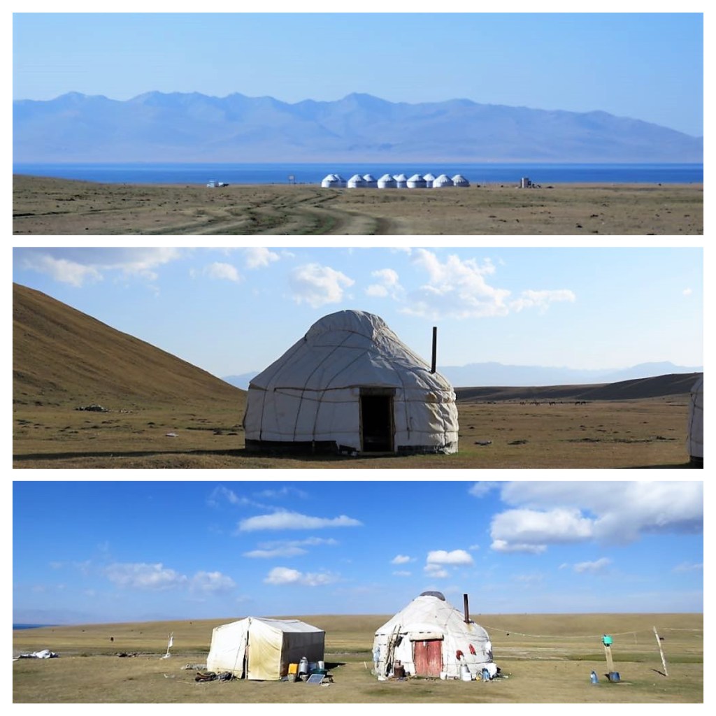 The further into the mountains we went, the worst the roads became and we continued to wind up to the highest pass at 3446m. As we finally reached Song Kul, we turned on to an unpaved road which quickly turned in to a dirt track. We passed people making hay, grazing sheep and horses, yaks hanging out on the side of the road. Oh, and don’t forget the stunning views.