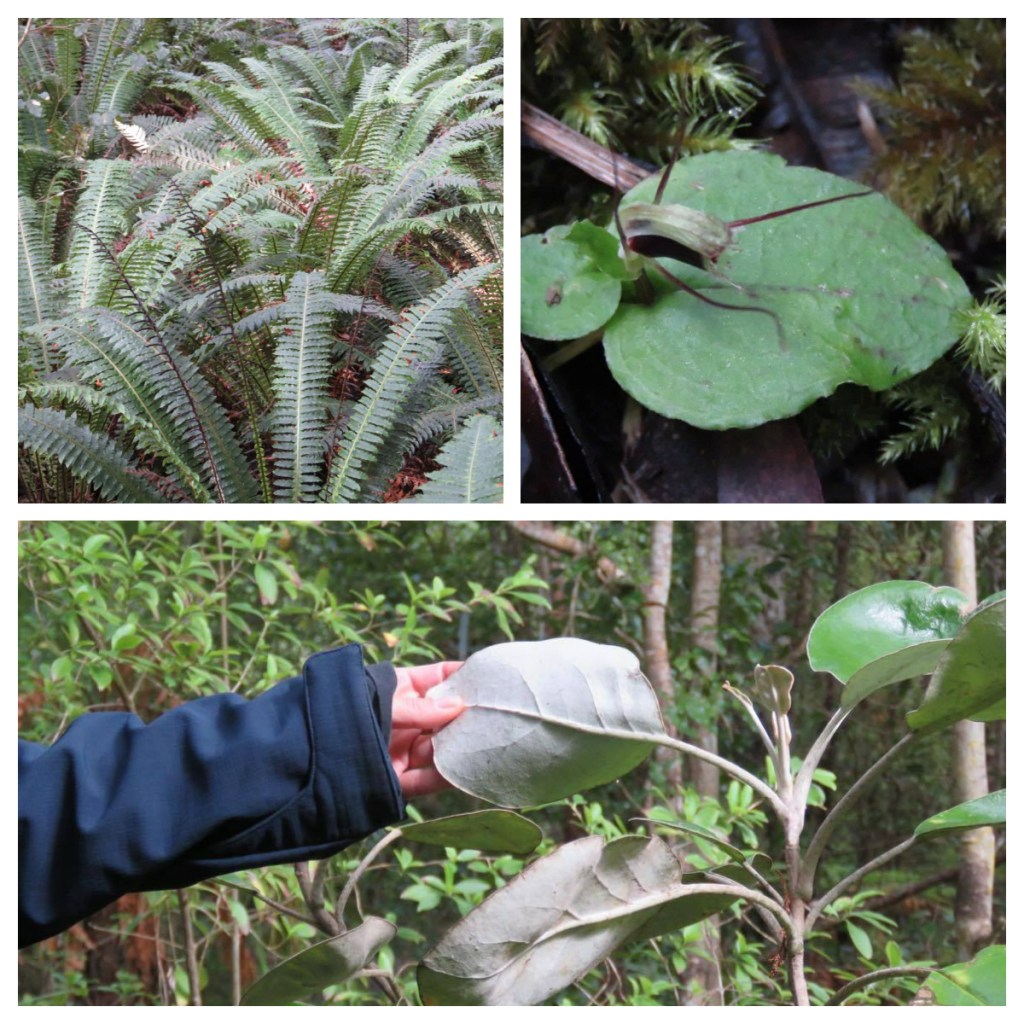 The bush is stunning, and as I previously mentioned, a perfect example of an ancient podocarp forest (one of the best in the country as it has never been cleared or milled). There are towering Rimu and totaras – apparently if a grown man can reach their arms around the Rimu and touch it is around 250 years old. The ground was full of beautiful umbrella mosses ❤️and Leah pointed out a so called dinosaur plant – a fern ally which is 400 million years old (perhaps not that exact plant, but the species itself)! We saw Spider Orchids, just starting to flower and bamboo orchids, not quite in flower yet and beautiful crown ferns with their connected root system. And don’t forget the cute Hen & Chicken fern whose spores grow as miniature ferns on its fronds before they drop off to set out into the world on their own lol. We were grateful to have Leah tell us lots of wonderful stories about the trees and plants – some fact, some a little more mythical.