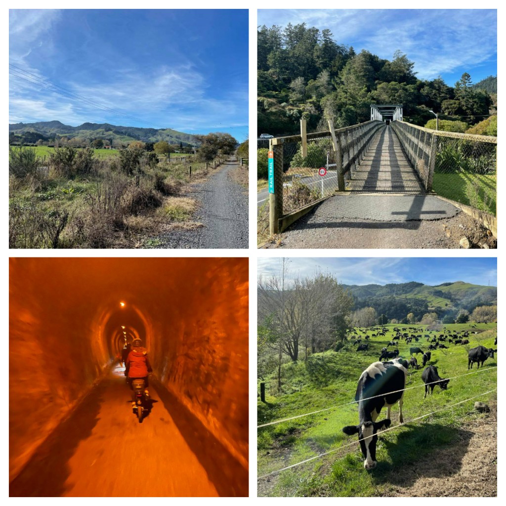 The Hauraki Rail Trail has a total of 197km of trails in 5 segments and we were going to do the small part from Paeroa and Waihi β only around 25km). It was a beautiful, easy trail through farmland, bush, over bridges and through tunnels. Although I had an ebike, but the trail was so easy I didnβt actually need to use the βeβ part of the ebike very often.