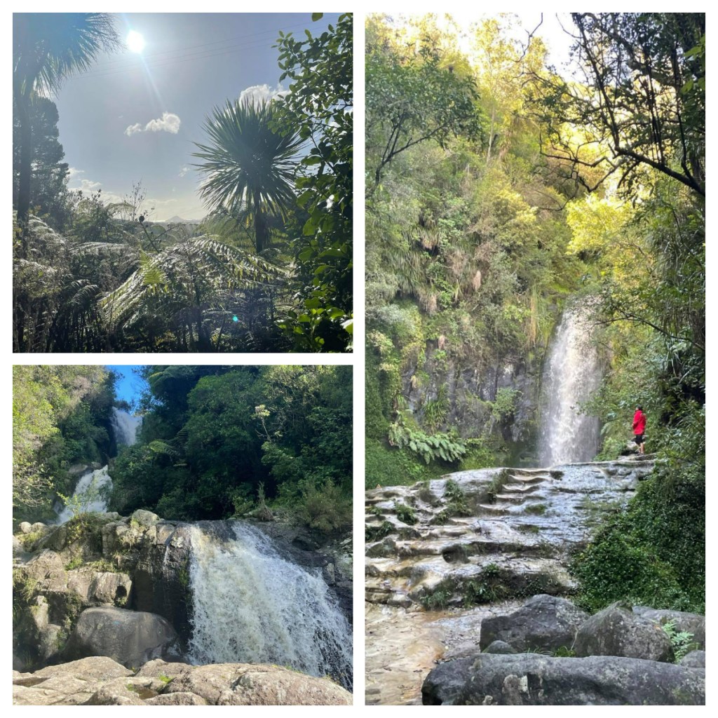 Our next step was at Kaiate (Te Rekekawau) Falls β where we had another beautiful walk to see the amazing full waterfalls. The walk was all down hill to the bottom of the Falls, so it was a bit of a hike back up but not too bad and it was a good excuse to stop and take in the lovely view back to Mt Maunganui from the track (it seems that everywhere we go, there is a view back to the Mount).