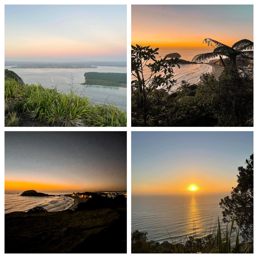 Finally, on Sunday morning I got up the Mt – and all my hill training certainly paid off. I think it was easier than the Bridal Path (my regular Christchurch walk), although the stairs were a bit of a killer as I was not used to them π. It was a lovely walk through bush, with the birds waking up and views back down the coast as the sky lightened. Sun rise was precisely on time – 7.09 ππ». There were beautiful views from the top back down to Papamoa and on the other side over the mouth to Matakana. It was well worth the early start.