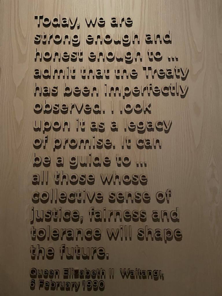 The trepidation was well founded – we boarded the boat which was already bouncing around in the protected harbour – and the first announcement they made was …. “It’s going to be really rough out there and we probably won’t make it to the Hole in the Rock!! Get off now if you are not up for that!” So we got off and thankfully received a full refund. Instead of the boat trip, we decided to walk the 30 minutes along the waterfront to the Waitangi Treaty Grounds.