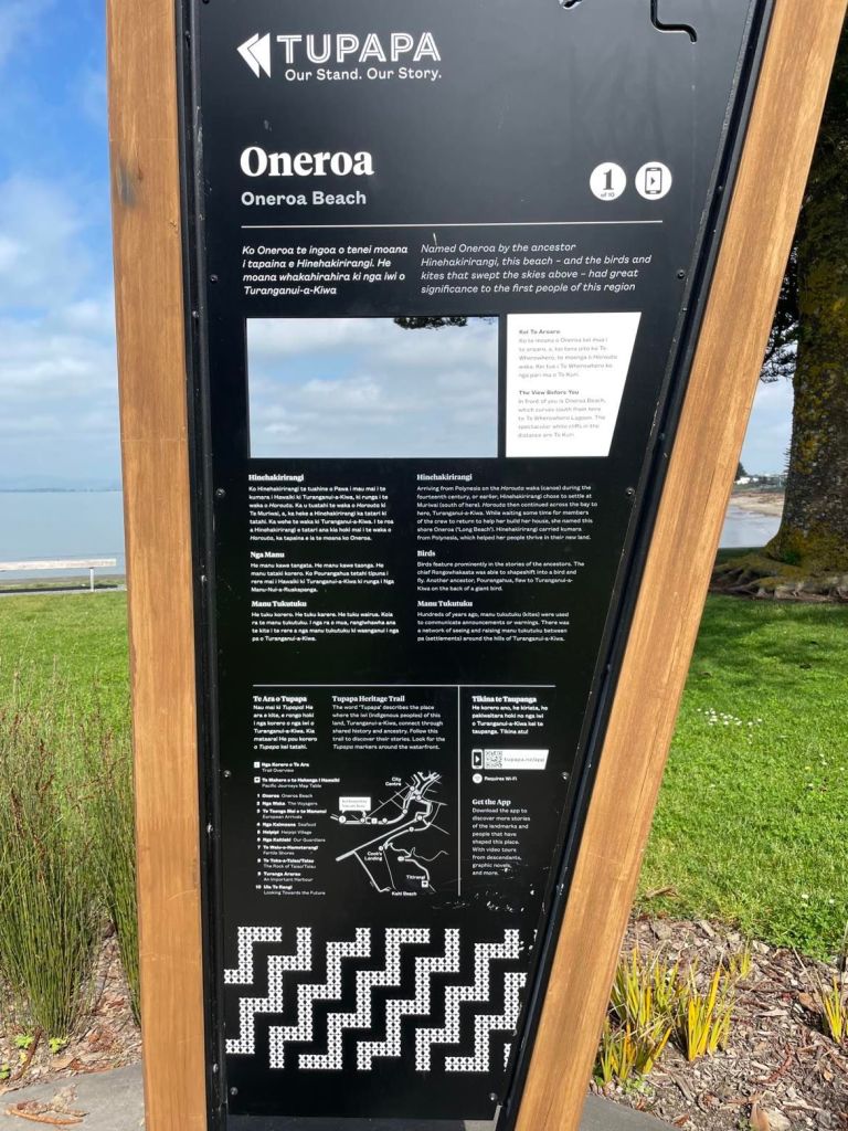 I walked along the Tupapa Heritage Trail. The physical information panels, along with the accompanying app gave me a great insight in to the history of the area. It was a lovely and informative walk, along the wide broadwalk that ran along the seaside and then down along the river. The beach was full of debris, showing the full force of the storms the week before.