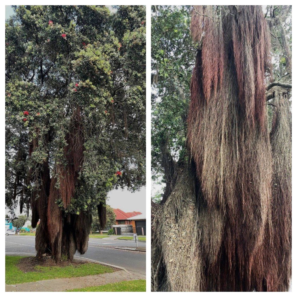 Did you know that some Pohutakawa trees have “beards”? These are actually matted clumps of aerial roots. Typically the appear in trees growing on banks and rocky cliffs where the “beards” can search crevices for additional soil and moisture (although in reality they rarely reach the ground). It is also believed that only some species or in fact hybrids grow these. It has certainly been common in many of the trees I have seen in the region.