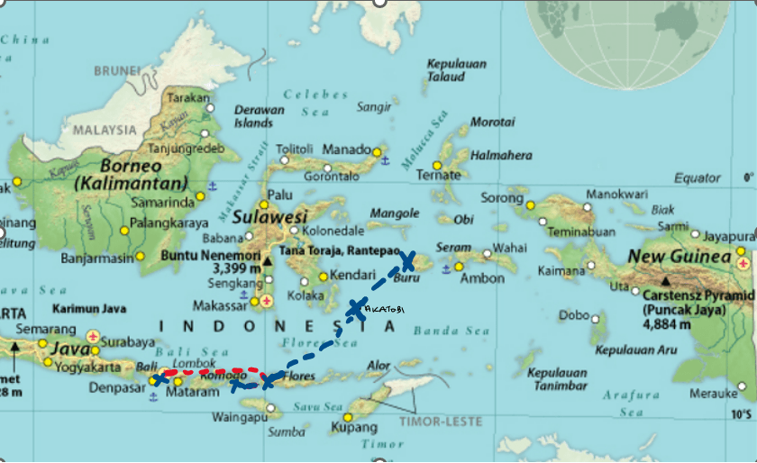 Having crossed the Banda Sea over night, I had another self-inflicted early morning, but this time even earlier due to the time change 🤔. It was a beautiful morning as we travelled towards Buru Island as the sun rose from behind it. Buru Island lies between the Banda Sea and the Pacific Ocean and is the third largest island Maluku Island group. It is not a big island, at 130km long and 90km wide, but it soars from the sea to 2,700m at its highest point. Around 210,000 people live here.