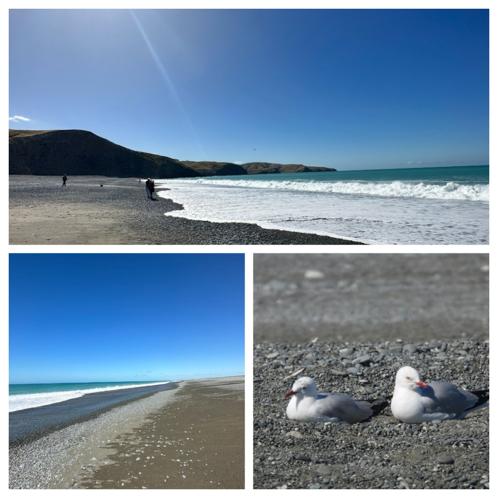 Back over the hills towards Christchurch I took a detour to the small settlement of Birdlings Flats, on the Kaitorete Spit. Another important site for the local Ngāi Tahu for food gathering. The spit itself was created around 6,000 years ago by gravel being brought down by the Rakaia River and then swept north by ocean currents before being deposited on the spit. It is very stony and pretty wild. Apparently, it is possible to find gems on the beach but I was not so lucky this time. Instead I just slogged through the stones, passed fisherman and small flocks of red bills gulls and terns hanging out together.
