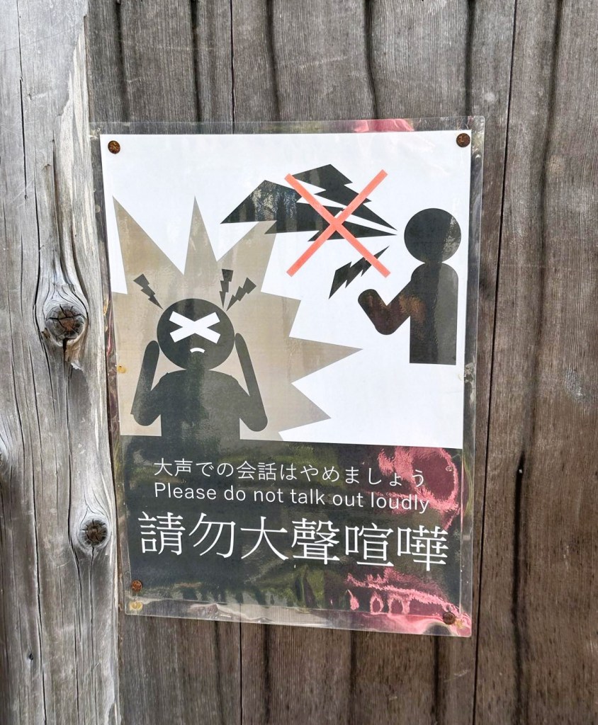 Everywhere you go, Japanese people are lovely and always willing to help. BUT, do not be loud in public! This means walking along the street, or, perhaps more importantly on public transport! Talking or laughing loudly will result in looks of distain from those around you. We even passed a sign in a street in Kyoto, warning of the dangers of being loud ๐ฌ