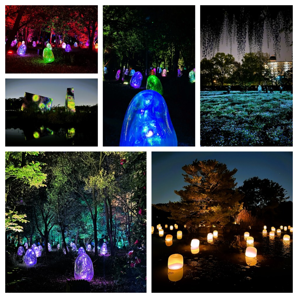 By this point my feet were throbbing and thankfully I had a couple of hours down time before it was time to set off again โ this time for the botanical gardens for the TeamLab experiment. TeamLab is an international art collective, a group of artists, formed in 2001 and they create digital artwork (in this instance) based on the concept of integrating advanced technologies and nature. I had wanted to go to their exhibition in Tokyo but just did not have the time so was really happy when Carla (who was also staying a few more days) said that they had a exhibit in the Osaka Botantical gardens.