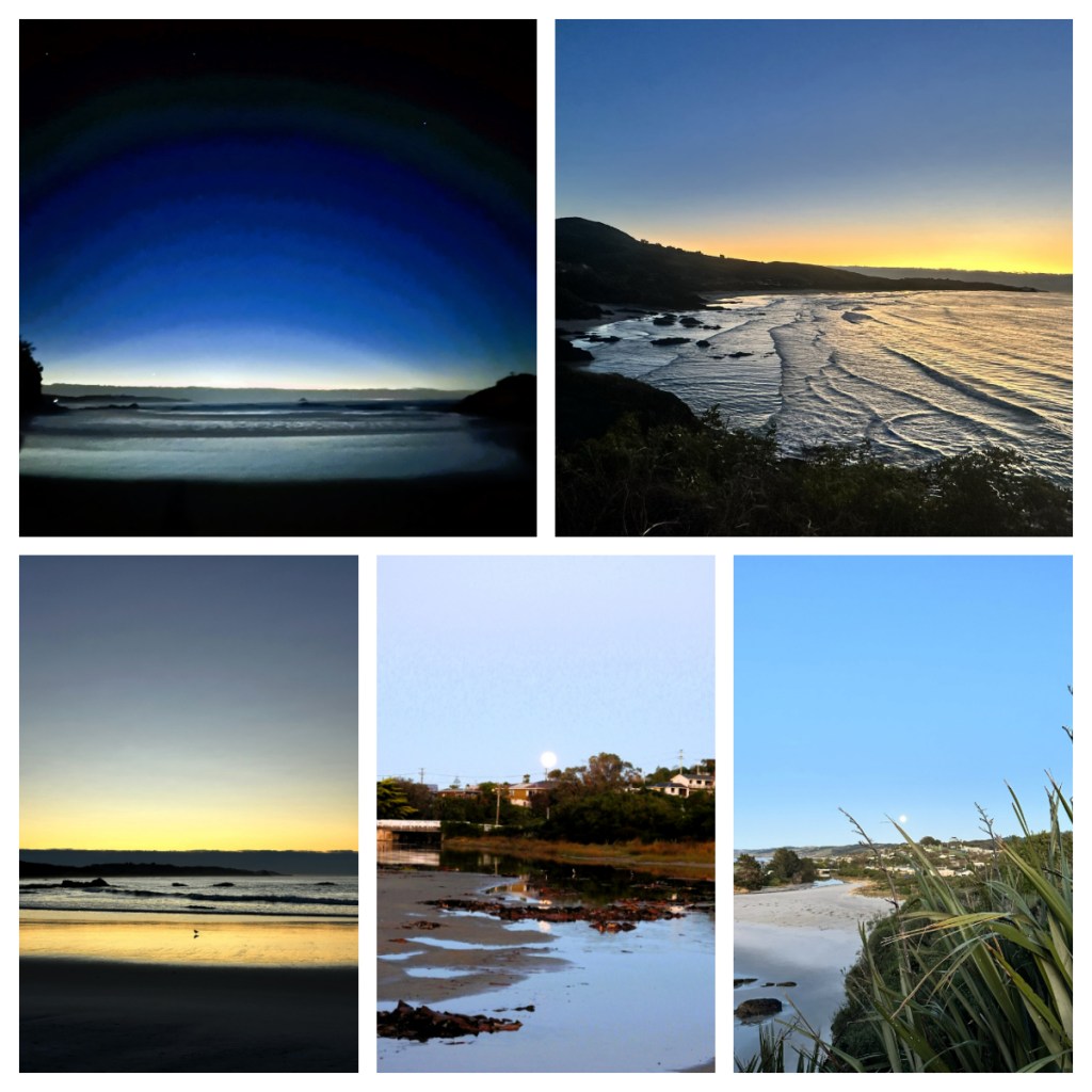 Harriet and I are both early risers, so we were up early on our first morning and headed out on a lovely walk down to see the sunrise. Unfortunately, there was cloud along the horizon so no real sunrise (and it did not help that there was another peninsular in the way to see it even if it was clear). To make up for that, there was also a huge full moon still on its down – it was a lovely way to start the day.