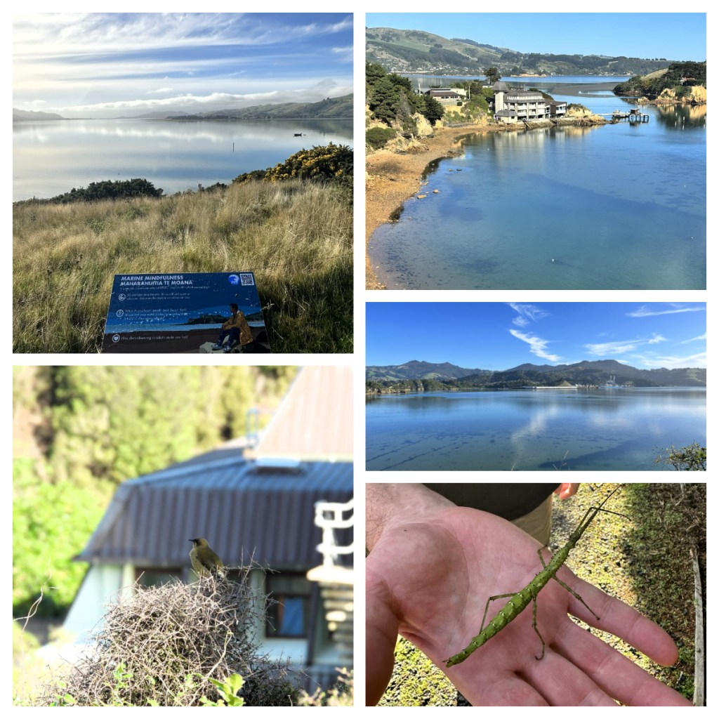 Right by the lab is the Portobello Peninsula Coastal bush, a lovely nature reserve that takes you out to the end of the Portobello peninsula. It had beautiful views and was teeming with life, much of which we would not have seen if we had not been with Rod, including a prickly stick insect and a native lowland grasshopper. The area also had some great new interpretive panels (created by a friend of Rod’s) that guides you to think about the nature around you.