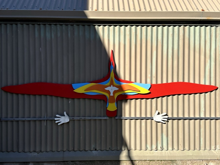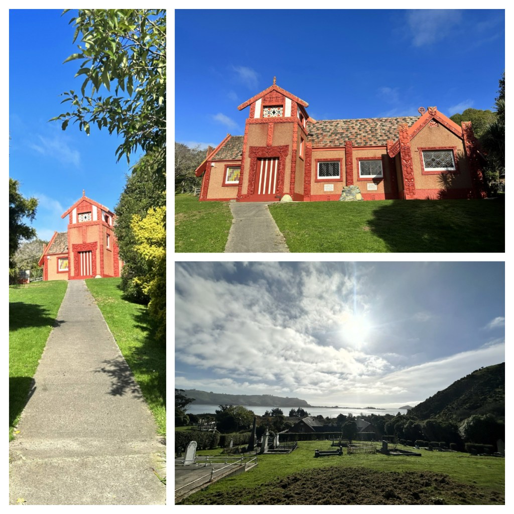 Back in the car, we followed the road that the skirts around the coastline (the tide was out now, and the wetlands were providing fruitful feeding grounds for a number of Royal Spoonbills). Our next stop as at the beautiful Ōtākou Māori Memorial Methodist Church. The current building (opened in 1941) replaces an original weatherboard church which was built on the same spot in 1865 which burnt down. Today, even the ‘carvings’ are set in concrete to protect it for the future.