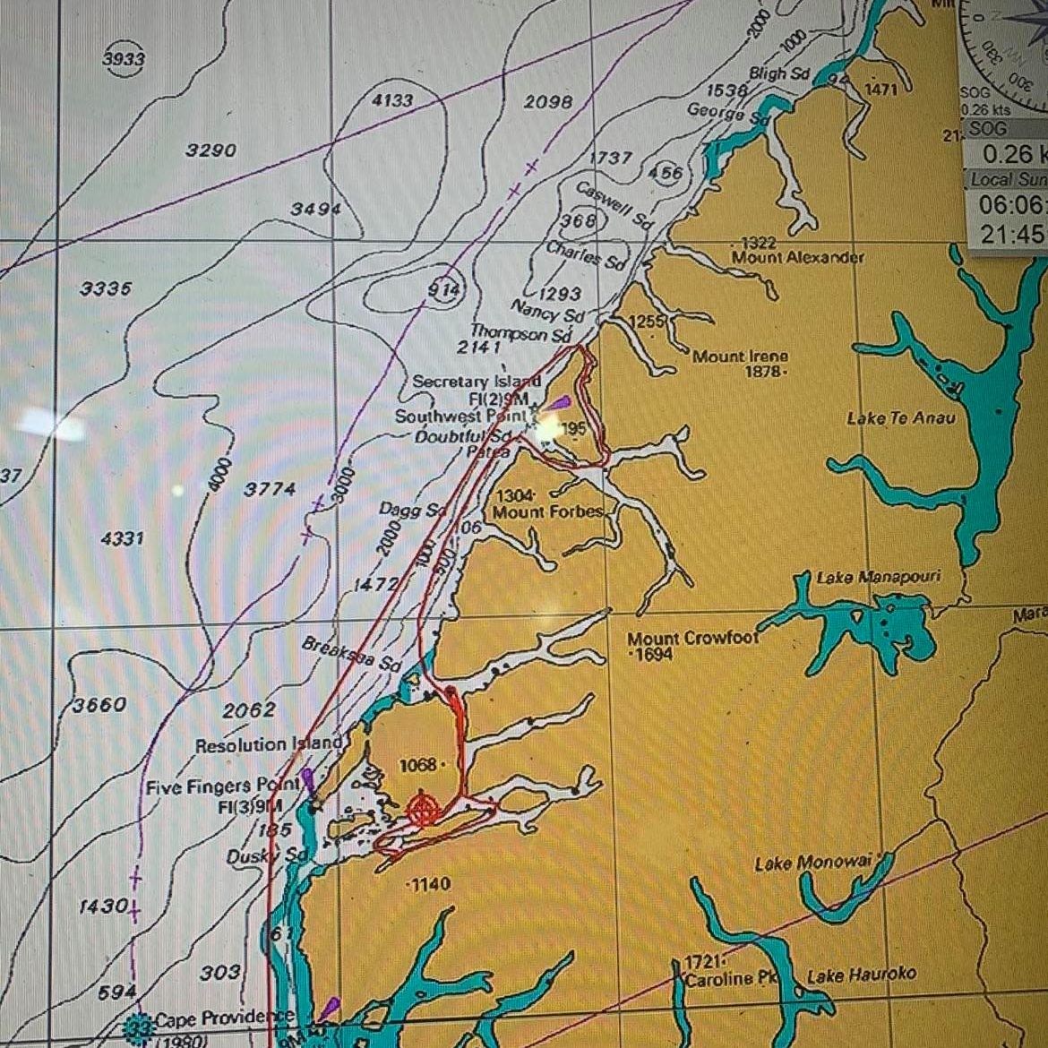 Day 5 and we work up in Cascade Cove in Dusky Sound, having travelled through the Acheron Passage during the night. I had slept well again with only a few hours of rolling during the night and it was yet another beautiful morning, a perfect morning for the helicopter flight some of us had booked.