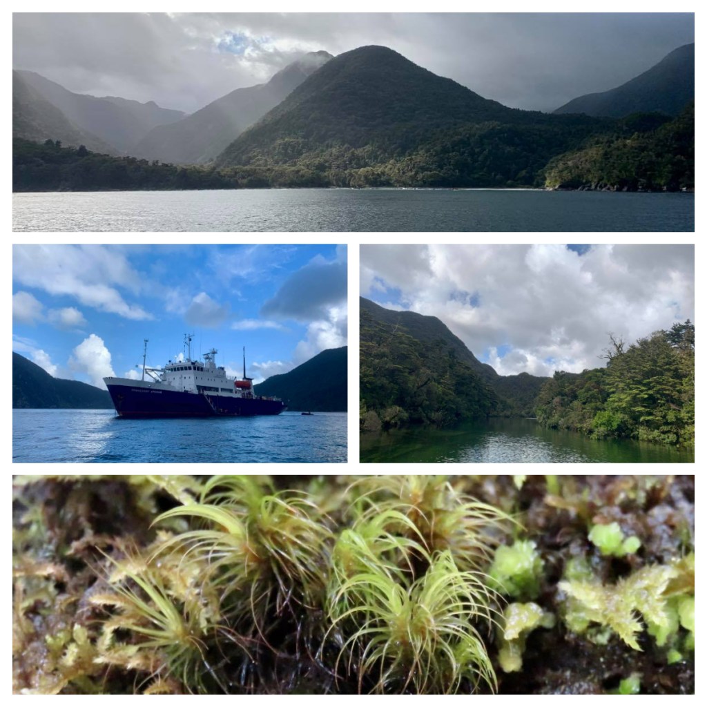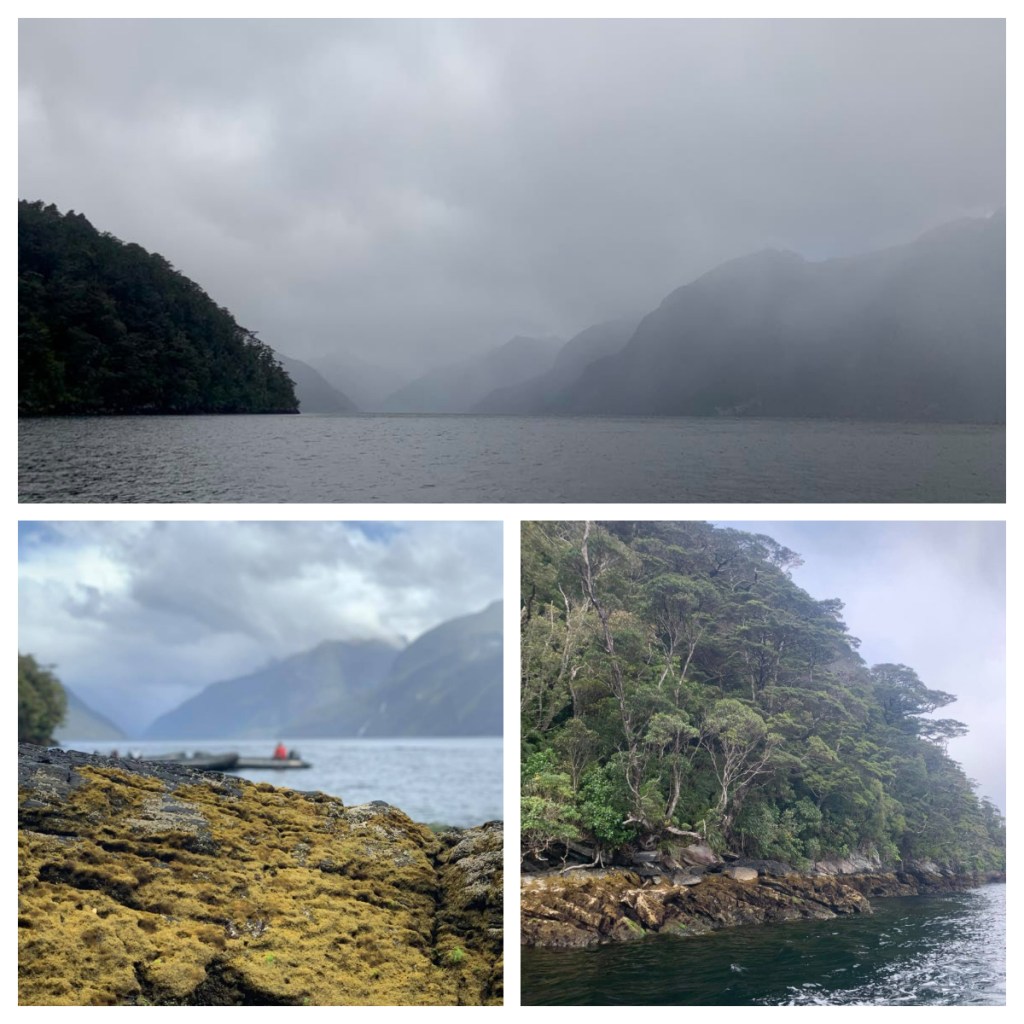 We were out in the zodiacs by 9am and we zipped around the northern end of the sound and then down a beautiful Pandora River. As with yesterday, the tide was on our side, otherwise we would not have got very far down the shallow river. It was beautiful and peaceful, and the river was lined with beautiful bush including flowering rata, kamahi and orchids. We were welcomed to the wonderful Fiordland weather with sun, rain and hail all in about 30 minutes 🤔. It seemed crazy as it was not that cold. Another great Fiordland feature was also out to greet us – sandflies, so many sandflies!! Luckily, we were pretty much covered from head to toe with our wet weather gear so there was not a lot of opportunity from them to bite.